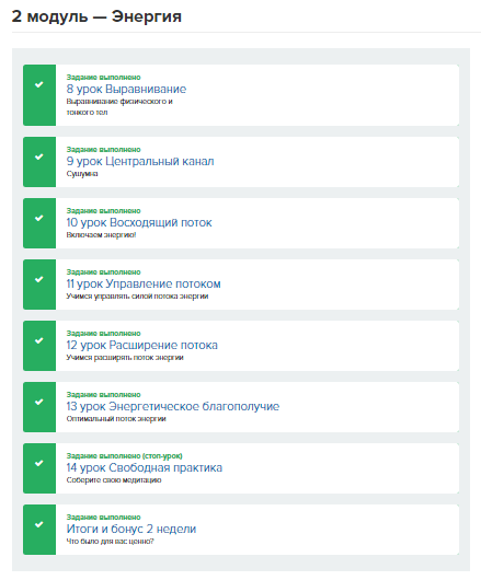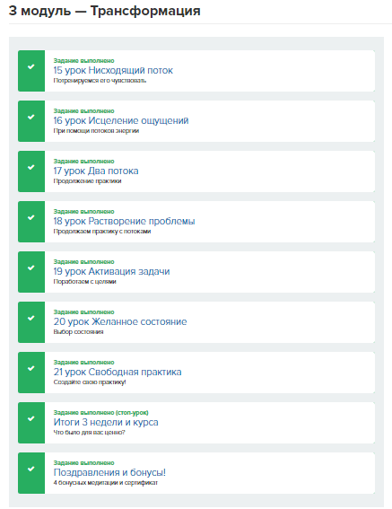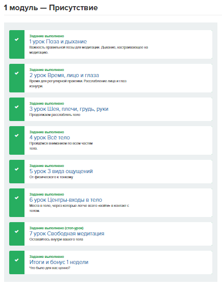 - В каждом уроке прорабатывается один небольшой, но важный этап медитации.